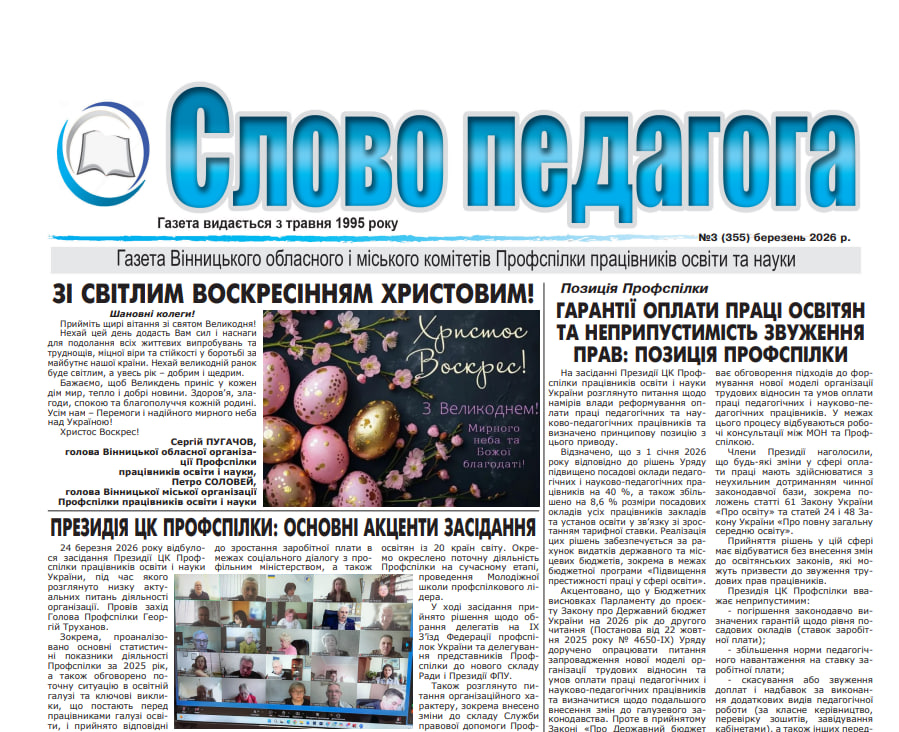 Слово педагога – випуск №3 (355) березень 2026 рЗавантажити:slovo_pedagoga_color-2026.pdf [4,59 Mb] (cкачиваний: 3)